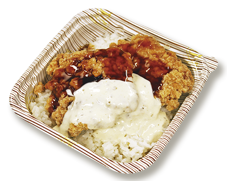 Bowl of rice with fried chicken with sweet and sour based and tartarsauce