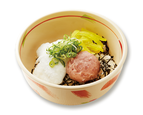 Bowl of rice with raw tuna Japanese radish grated yam, soy sauce