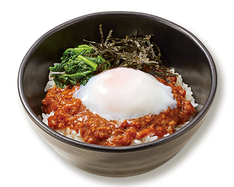 Bowl of rice with minced chicken and half boiled egg with chinese chili sauce