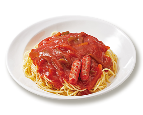 Spaghetti in starch tomato sauce with vegetable and fish sausage